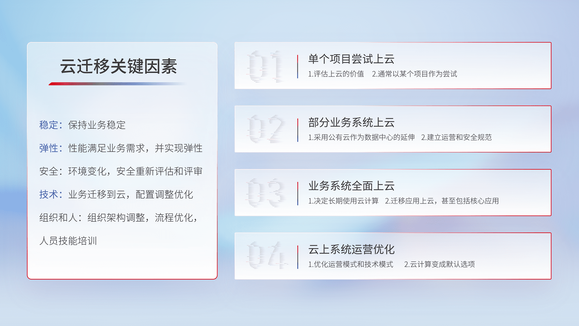 结合实际业务,,,,从规划设计、、、、云平台选型、、、云原生改造、、数据迁移、、、集成交付,,,迁移全过程为客户识别最佳上云路径,,,,做好风险识别管理,,,设计网络架构、、身份权限、、、、安全审计合规、、、操作审计、、日志审计、、监控告警策略、、多站点容灾设计等,,,对云上基础设施进行整体规划,,提升IT治理水平,,,,以满足弹性、、高可用、、、、高性能的需求。。。