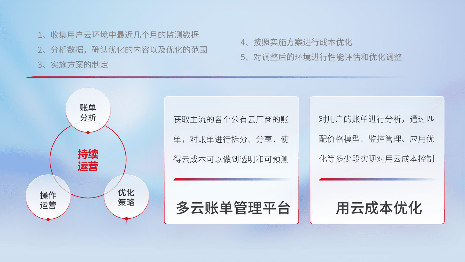 通过多云纳管,,,,以统一的资源数据模型把客户的云资源进行抽象和封装,,,,进而实现对多云资源的统一操作,,,保障云资源管理的可靠性、、、、稳定性与可用性。。。量身定制化运维内容,,,,配置、、、开发运维、、补丁管理、、、备份、、、、监控、、认证和访问管理、、审计和日常巡检等,,保障在用云过程中的可靠度,,,稳定度以及高可用率。。。
