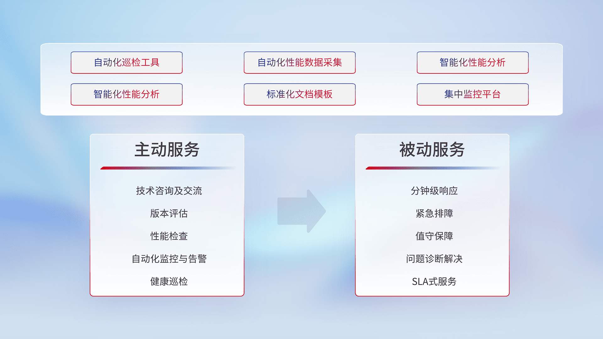智能化工具和标准化文档,,,保障服务质量,,提供主动服务(包含技术咨询、、、版本评估、、性能检查、、自动化监控与告警、、、健康巡检)和被动服务包含(分钟级响应、、紧急排障、、值守保障、、问题诊断解决、、、、SLA服务)。。。。