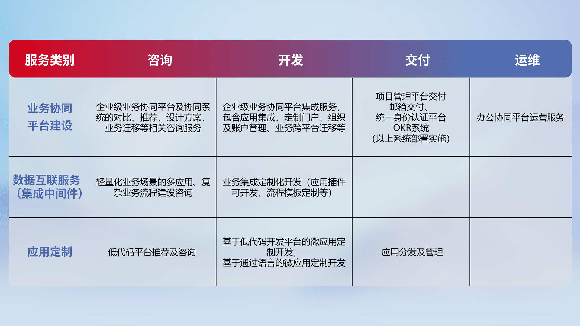 针对钉钉、、、、企微、、、IDaas等平台级产品提供产品的规划、、、方案、、、交付、、、、定制化开发等服务,,,,实现如统一协同办公、、、智能客户服务、、、、混合会议管理、、、智能数据查询、、、等业务场景,,,,实现数字化转型。。